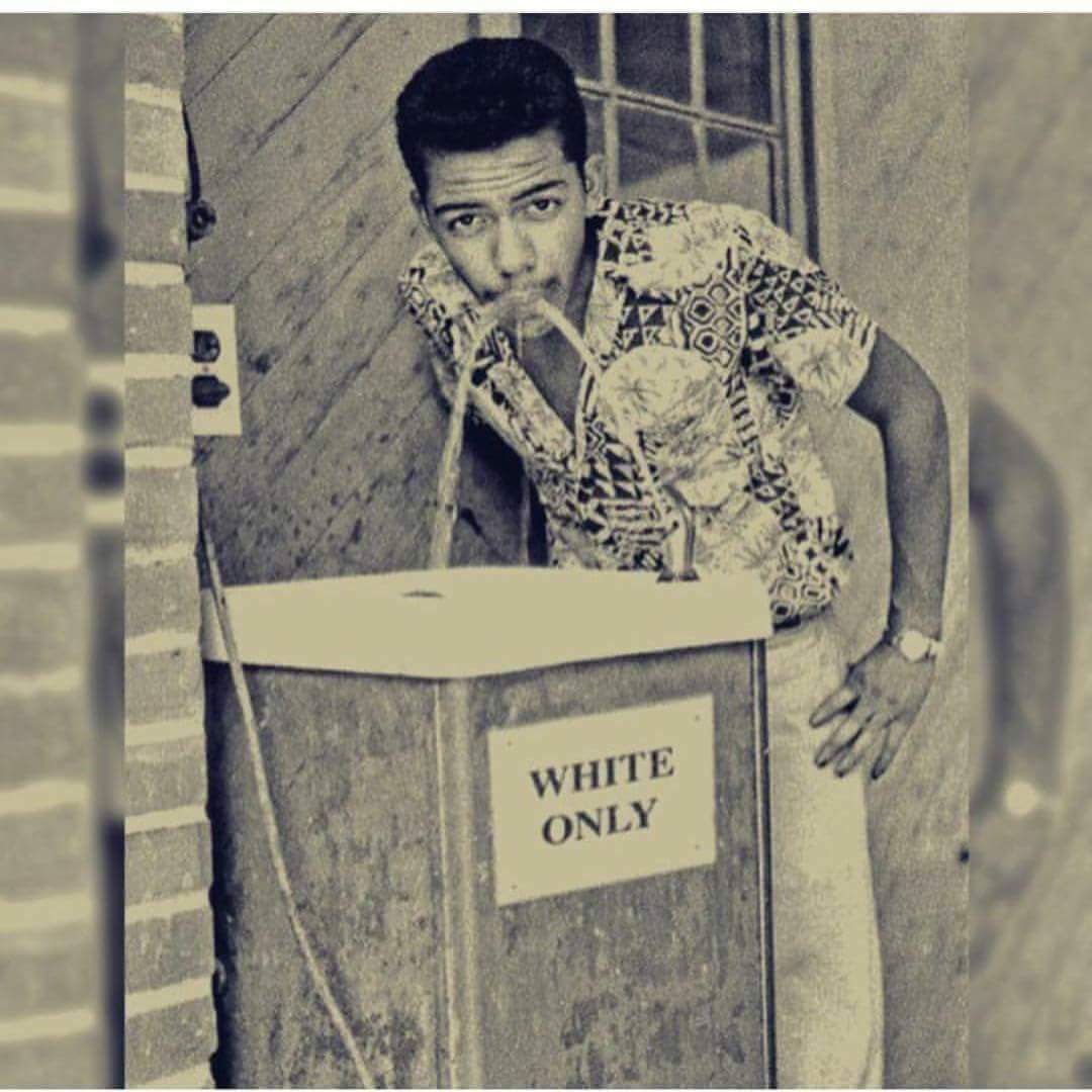 Stylish black man takes a sip from a “whites only” water fountain, 1960s.