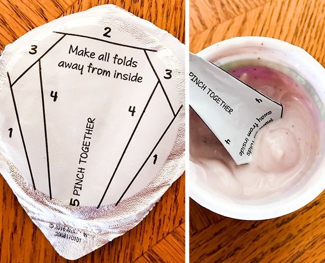 9 – Que tal essa tampa de iogurte que já tem as instruções de como transformar a tampinha em uma colher?!