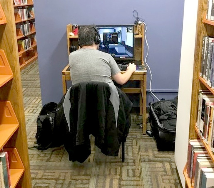Trajo su computadora de juegos a la biblioteca, además, en varias bolsas