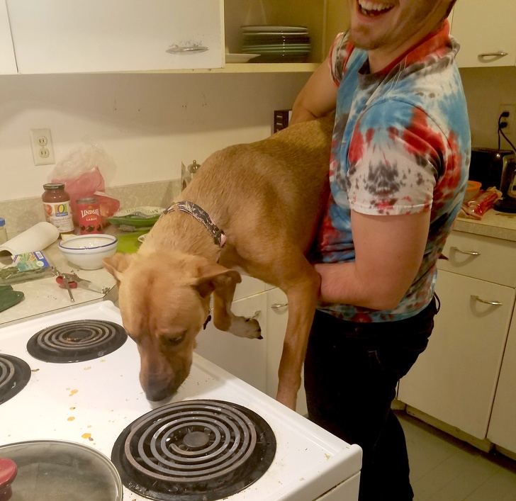Esto es lo que pasa cuando le pides a tu esposo que limpie la casa. Parece que el perro está feliz de ayudar