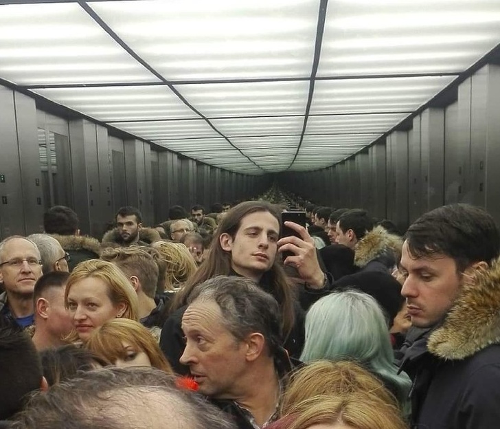 Una selfie en el ascensor, rodeado de una multitud de personas: es todo un desafío, pero no para este chico tan relajado