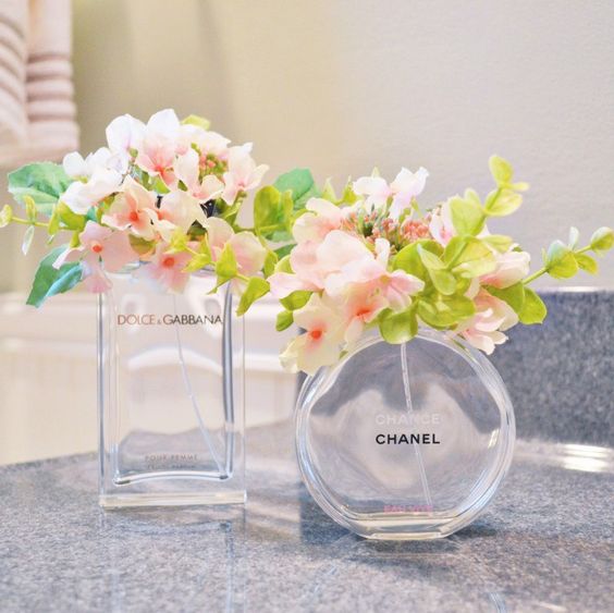 Looking for a decorative vase? Just take the top off of a perfume bottle and put your flowers in. It makes for a very chic vase.