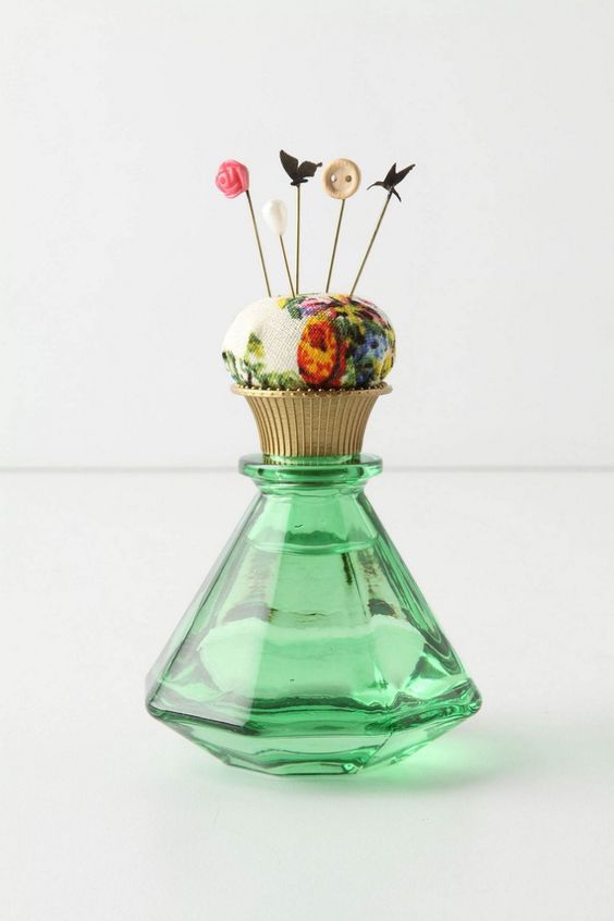 Perfume bottles make the cutest pincushions. Cover the top of your perfume bottle with some fabric filled with stuffing. Glue this to the top of your perfume bottle and use as a pin cushion.