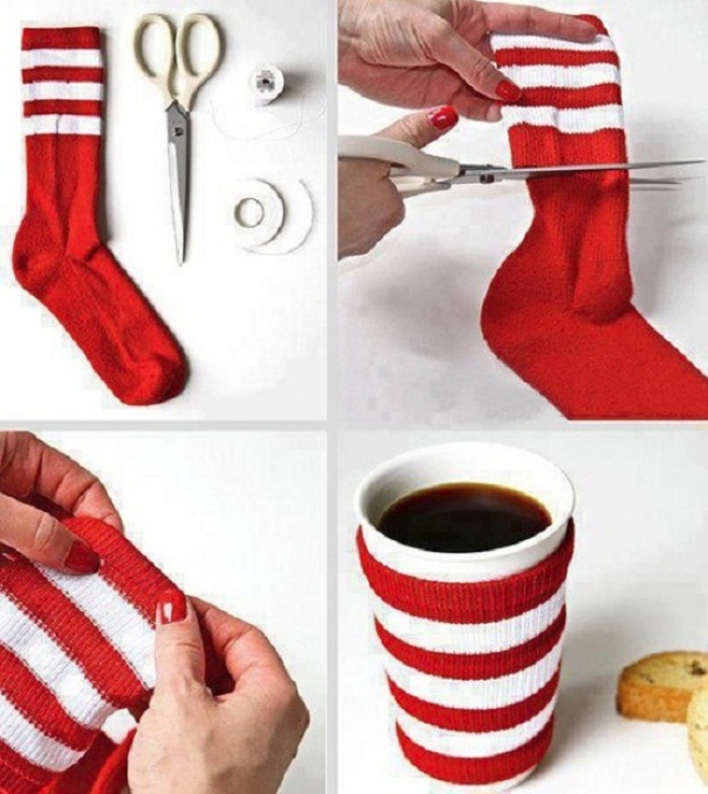 Esta ideia original é muito boa para quem curte bebidas quentes, mas não gosta da ideia de queimar as mãos. Mas lave as meias antes :P