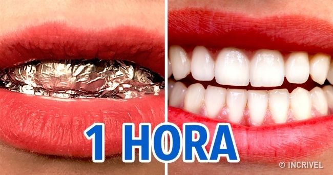 Misture um pouco de bicarbonato de sódio com creme dental e em seguida aplique uma grossa camada da mistura no papel alumínio. Grude-o bem aos dentes. Em uma hora, retire o papel alumínio e enxágue bem a boca.