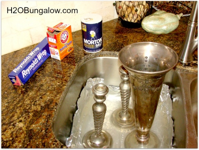 Para limpar peças de prata, coloque papel alumínio no fundo do recipiente, adicione bicarbonato de sódio, sal e água fervida.