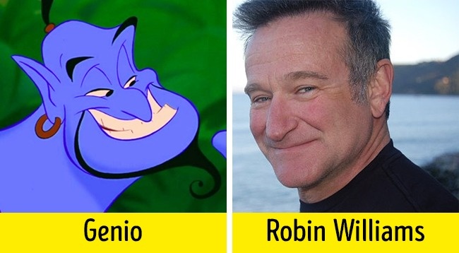 El genio, dispuesto a cumplir cualquier deseo, fue doblado por Robin Williams. Si miras bien al personaje azul podrás reconocer en él al famoso actor.