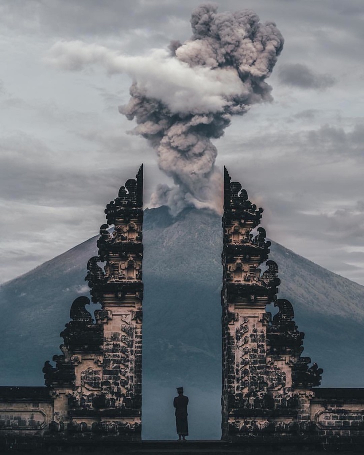 8. El cuidador de un templo observa la erupción de un volcán en Bali