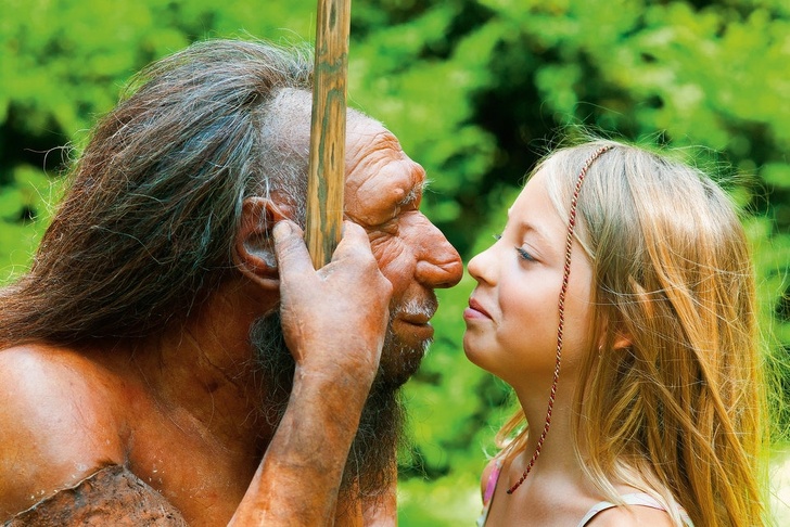 6. A través de miles de años: una niña y la figura de un neandertal de un museo