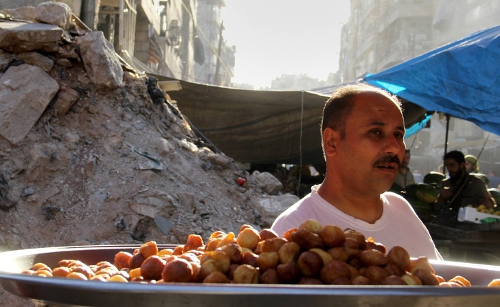 5. Un hombre vende dulces en una ciudad devastada por la guerra