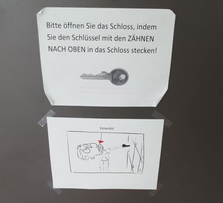 “Por favor, cuando abras el candado, inserta la llave en la cerradura con los DIENTES HACIA ARRIBA”