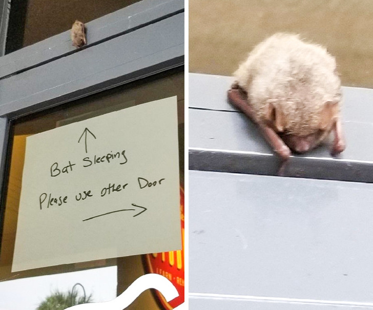 “Aquí hay un murciélago durmiendo. Por favor, usa la otra puerta”.