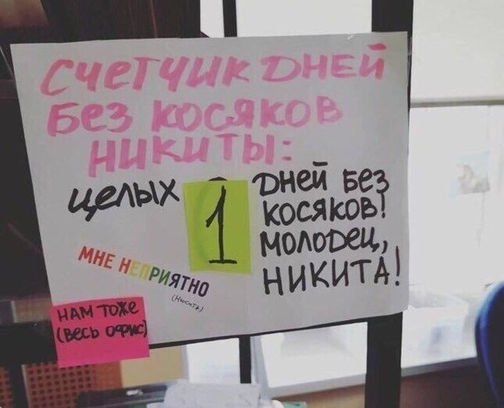 “El contador de días sin disparates de Nikita. ¡1 día entero sin disparates! ¡Bien hecho, Nikita! Esto no me hace sentir bien (Nikita). A nosotros tampoco (toda la oficina)”.
