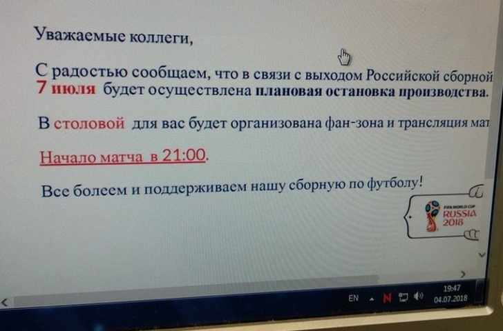 “Estimados colegas, tenemos el gusto de notificarles que, debido al partido de la selección de Rusia, el 7 de julio tendrá lugar una detención planificada de la producción. En la cafetería se organizará una zona de apoyo y se transmitirá el partido. El comienzo del partido es a las 21:00. ¡Apoyemos y alentemos a nuestra selección de fútbol!”