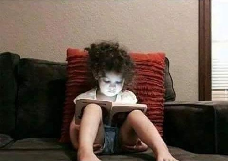 “Minha filha, muito comportada, lendo seu livro de tarefa de casa… Espere um minuto, por acaso os livros emitem luz?”