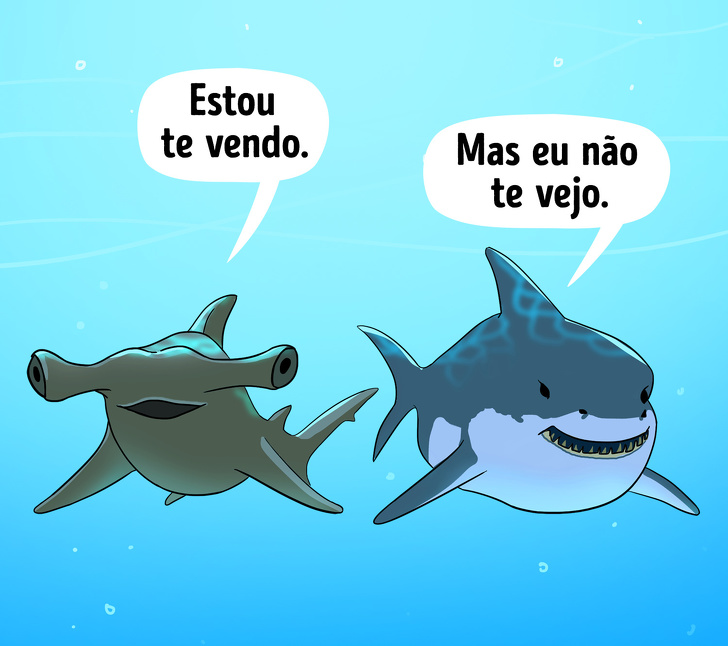 O tubarão-martelo se alimenta de arraias, que têm pontas venenosas em suas caudas. Mas elas não são uma ameaça para eles, porque os tubarões têm imunidade inata às neurotoxinas. No entanto, perder os olhos significaria morte certa para esse predador. Com o tempo, a evolução ajustou a posição dos órgãos da visão de tal maneira que as pontas das arraias não pudessem alcançá-los. Além disso, essa disposição dos olhos permite que esses predadores percebam antecipadamente os indivíduos mais perigosos, conseguindo assim sobreviver.