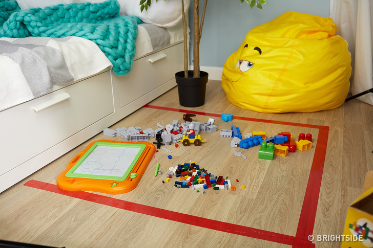 Children love to scatter toys around the house. Try this tip: choose a place where a child can play and mark it with bright scotch tape. Explain to the child that there’s a new rule: no toys should be placed outside this area.