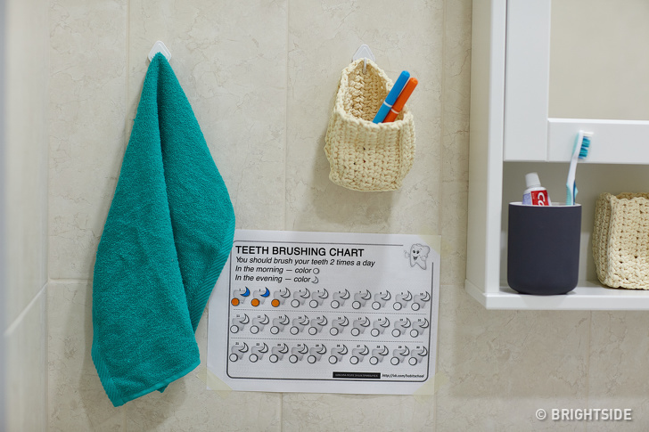 Find a picture on the Internet or draw yourself a teeth brushing chart. Hang it on the wall in the bathroom and place colorful markers somewhere nearby. Ask a child to color this chart every time they brush their teeth: a sun for in the morning, and moon for in the evening.