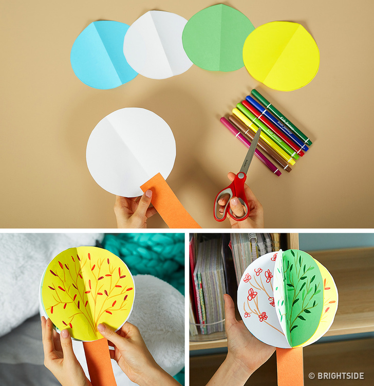Each circle is a season, so decorate it accordingly. For example, add snow for winter, buds and flowers for spring, and green leaves and yellow leaves for summer and for autumn.
