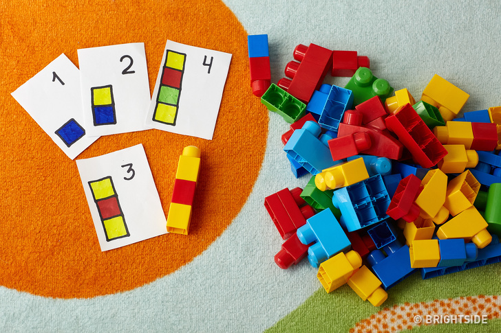 A child should build the same tower as described on the card. This task will help put mathematics into practice.