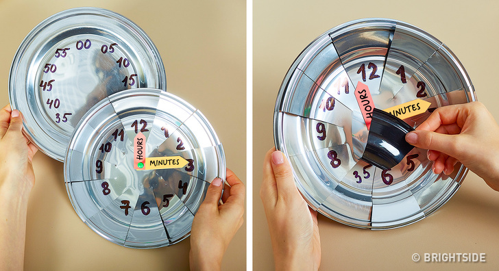 - Use a pin and 2 paper arrows with the text “hours” and “minutes” to put the plates together.