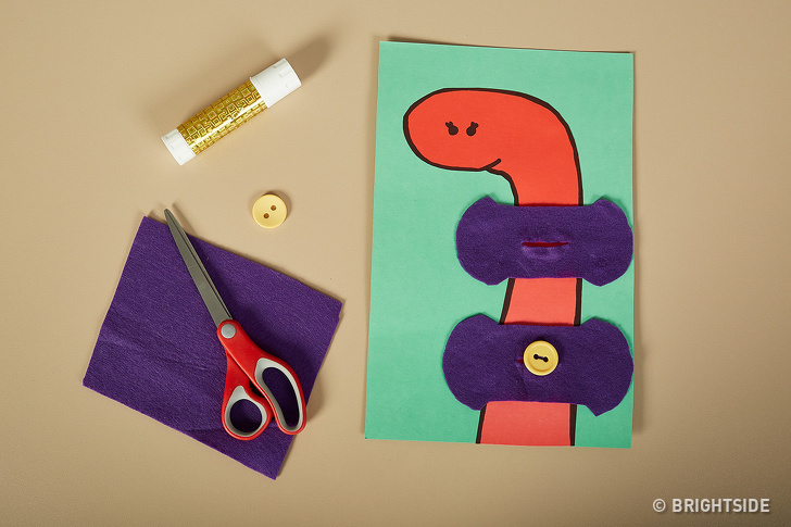 You can make this fun toy to teach a child how to button and unbutton. Cut a worm out of colored paper, sew buttons on it, and glue pieces of soft fiber with small cuts in it.