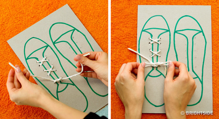 But what if we drew boots on a piece of cardboard, made small holes, and put shoelaces in it? You can easily take this simulator with you: no more shoes will be scattered around the house and you won’t have to check if a child is playing with clean boots. As a bonus, you can learn new ways to lace up your shoes too!
