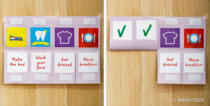 Put some toothpaste and a toothbrush, a towel, and a hairbrush in different glasses and number them. Thanks to this step-by-step organizer, children won’t forget any of these important steps.