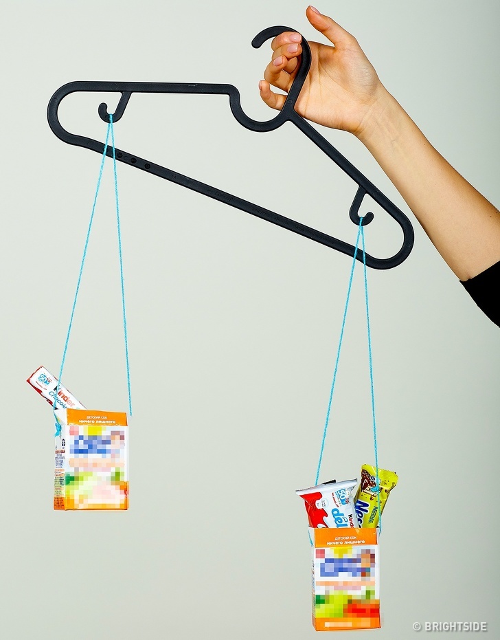 Take a clothes hanger and 2 containers, and paper cups or empty juice boxes. Make 2 holes in the containers, thread a rope through them, and attach it to the hanger. Balance the scales and fill each container with cookies, candy or chocolate bars. Now children will learn how to share and stop arguing about who should get more candy.