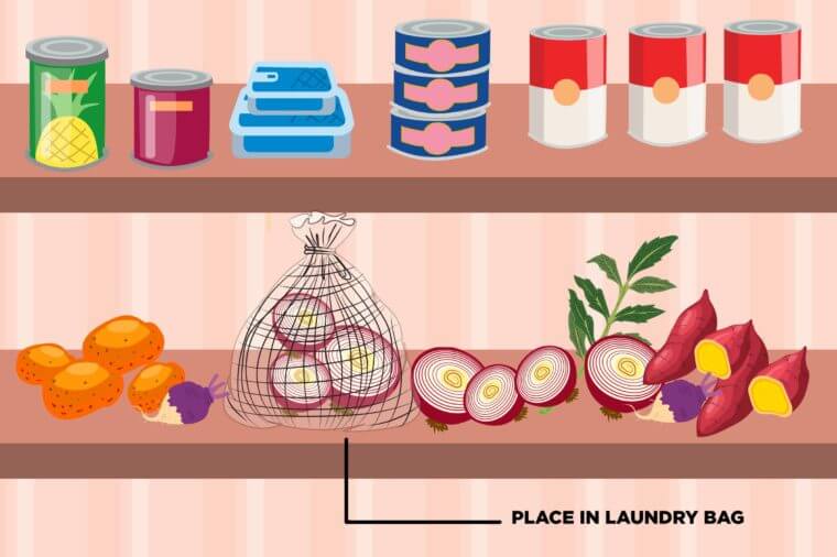 Ob Sie es glauben oder nicht, Zwiebeln, Knoblauch und andere Produkte mit Raumtemperatur gehören in Wäschesäcke – nicht in Ihre Regale. Aber dieser Küchen-Organisations-Tipp reduziert nicht nur das Durcheinander; Sie können auch verhindern, dass die trockene Haut den Boden und die Regale der Speisekammer verstreut. Außerdem erhöhen die Netzbeutel die Luftzirkulation und halten das Produkt länger frisch.