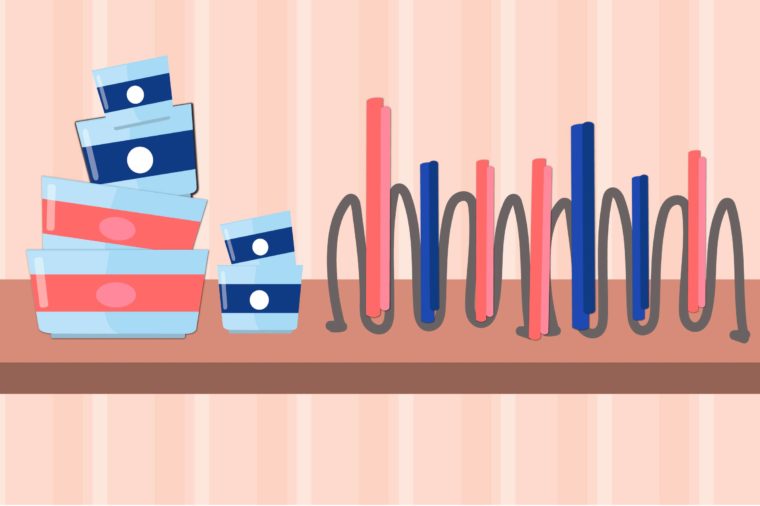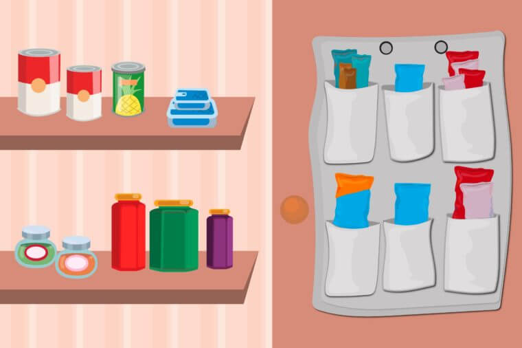 Anstatt zufällige Snacks, Gewürzpakete und Kool-Aid-Pakete in Ihrer Speisekammer zu verstauen (und wertvolle Ablageflächen zu belagern), hängen Sie einen Schuh-Organisator an die Tür und füllen die Schlitze mit diesen losen Gegenständen. Sie wollen auch diese Gewohnheiten von unordentlichen Menschen stehlen.