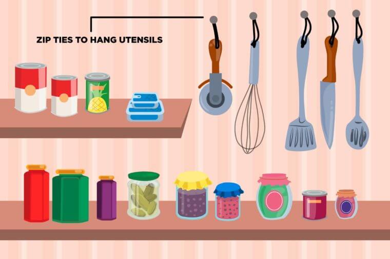 Verwenden Sie Kabelbinder zum Aufhängen von Utensilien