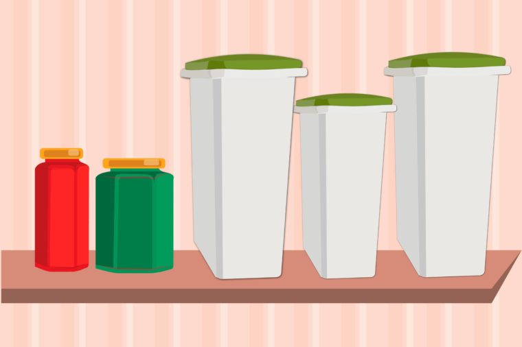 Klare, etikettierte Behälter sind der beste Freund eines überladenen Kochs. Lagern Sie Getreide, Reis und andere trockene Waren in Plastikgefäßen oder Eimern, um Ihre Speisekammer mühelos aufzuräumen. Besser noch, halten Sie einen kleinen Messbecher an der Seite jedes Behälters mit einem Befehlshaken zum bequemen Schöpfen. Machen Sie nicht diese Fehler, die Ihre Küche schlampig wirken lassen.