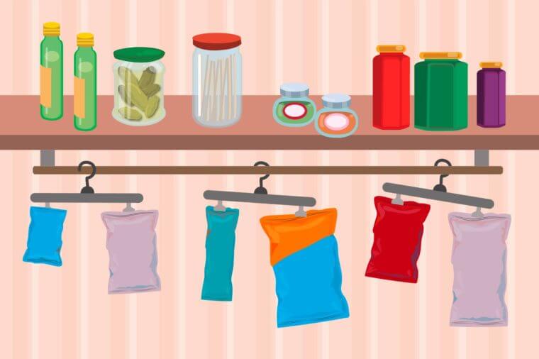 Endlich können Sie diese lästigen Clip-Kleiderbügel für Ihre Kleidung einsetzen. Anstatt die Säcke mit Chips und anderen Snacks in Ihrer Speisekammer stauen zu lassen, befestigen Sie sie an einer kleinen Gardinenstange unter einem Regal.