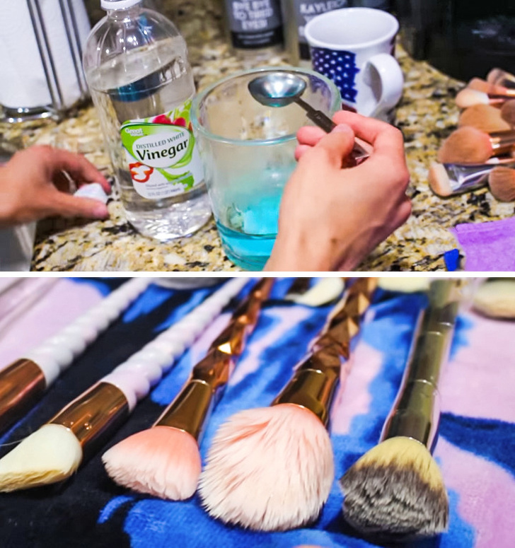 Tradicionalmente, las brochas se lavan con champús especiales, pero esta no es una opción demasiado económica. Hay una manera económica y sencilla: diluir en un recipiente con agua tibia 1 cucharadita de lavavajillas líquido y agregar 1 cucharadita de vinagre habitual, enjuagar bien la brocha. Las brochas estarán perfectamente lavadas, y después de secarse no perderán su apariencia y propiedades.