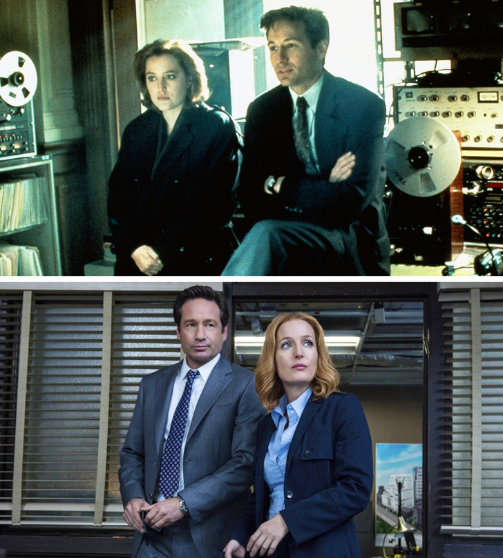 David Duchovny (Fox Mulder) y Gillian Anderson (Dana Scully) en la serie The X-Files en la primera temporada, en 1993, y la décima en 2016