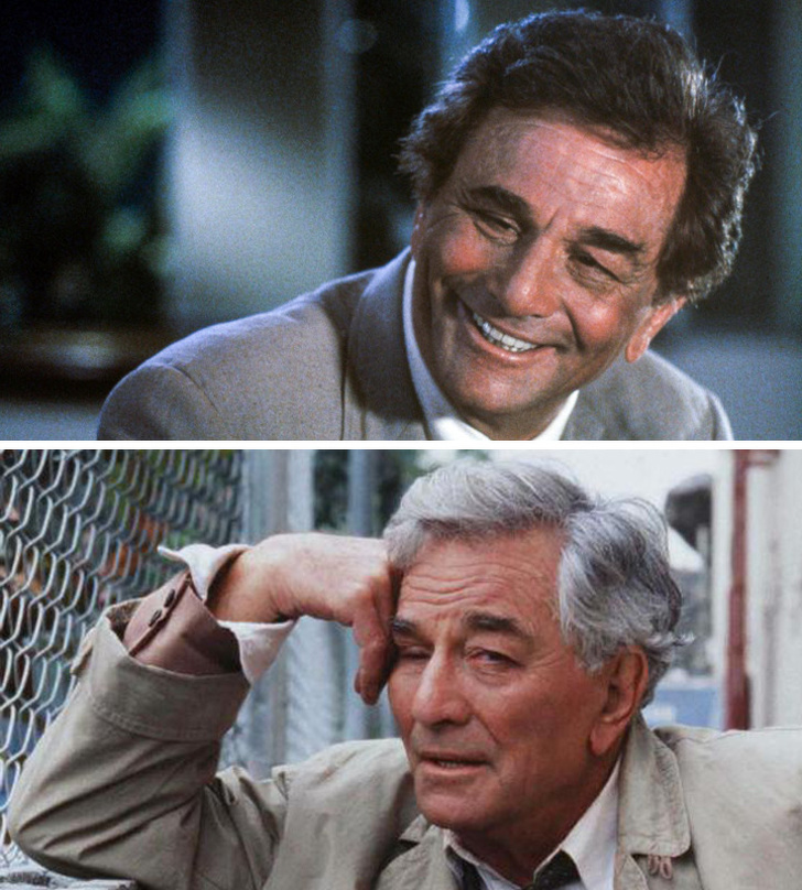 Peter Falk (Lt. Frank Columbo) en la serie Columbo (1968) y en la película Colombo: A Colombo le gusta la noche (2003)