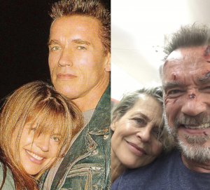 Arnold Schwarzenegger (Terminator T‑800) y Linda Hamilton (Sarah Connor) en la película Terminator 2: el juicio final (1991) y en la filmación de la película Terminator 6, cuya fecha de estreno está planeada para el 2019