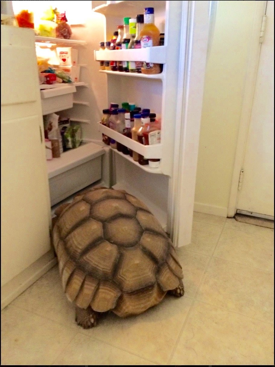 Guy heard a noise and came downstairs to find this tortoise rummaging through his refrigerator.