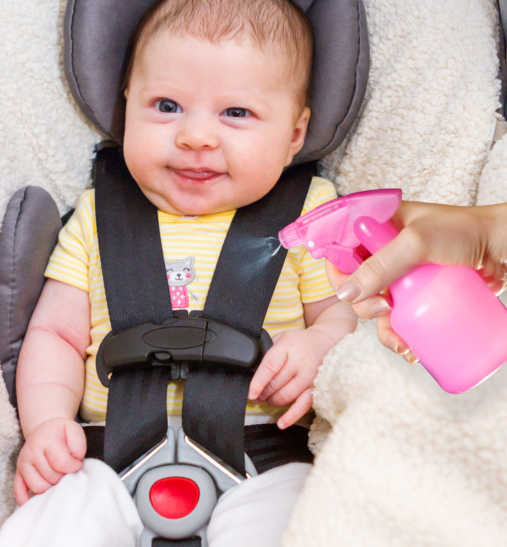 En días de calor, los cinturones de seguridad se calientan mucho al sol, lo que puede provocar que el niño llore. Para enfriarlos, humedécelos con agua usando un pulverizador.
