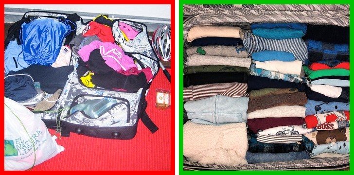 13. Ao embalar roupas, enrolá-las pode ajudar a dar mais espaço