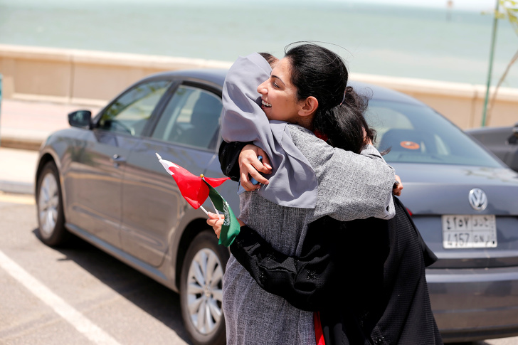 13. Una joven de Baréin felicita a una mujer saudí porque ya puede conducir un automóvil