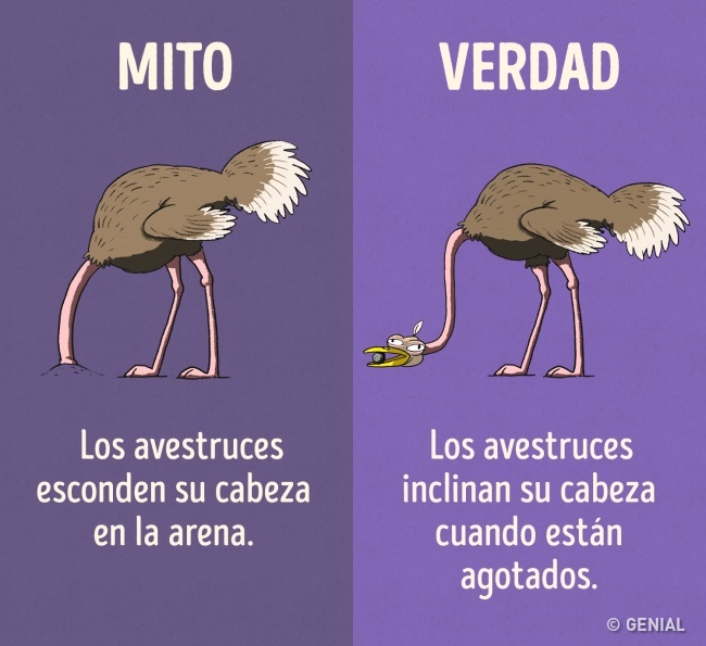 A pesar de los numerosos conocimientos sobre el mundo animal, muchos siguen creyendo datos que se transmitieron de generación en generación desde hace cientos de años. Por ejemplo, la opinión popular de que los avestruces esconden su cabeza en la arena proviene de las obras del pensador romano Plinio el Viejo, quien aseguró en sus escritos: “Ellos imaginan que cuando han escondido su cabeza y su cuello dentro de un arbusto, todo su cuerpo está oculto”. Pero estaba equivocado.