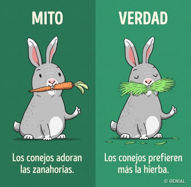 Gracias al conejo Bugs Bunny, este mito se hizo del todo popular. Por supuesto, los conejos comen zanahorias, pero prefieren mil veces más la hierba y las hortalizas de hojas verdes.