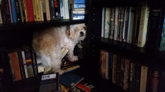“Nuestro perro le tiene mucho miedo a los truenos. Y cree que está más seguro entre los libros”.
