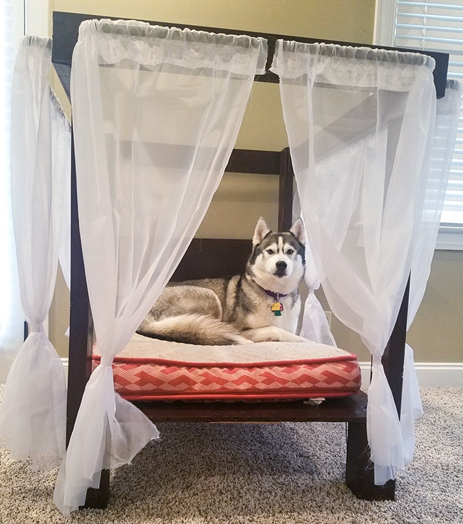 8. Este husky tiene una cama propia con dosel que le gusta mucho