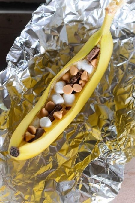 Camping is all about the food. Slice open a banana and cram in some marshmallows and chocolate/peanut butter chips.