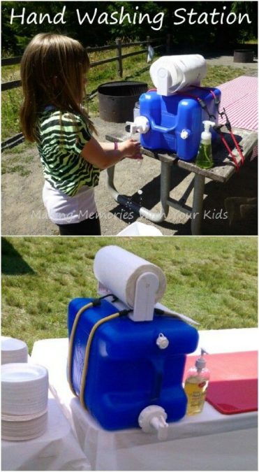Use a drink cooler, some bungee cords, and a roll of paper towel to create a station specifically for washing hands.