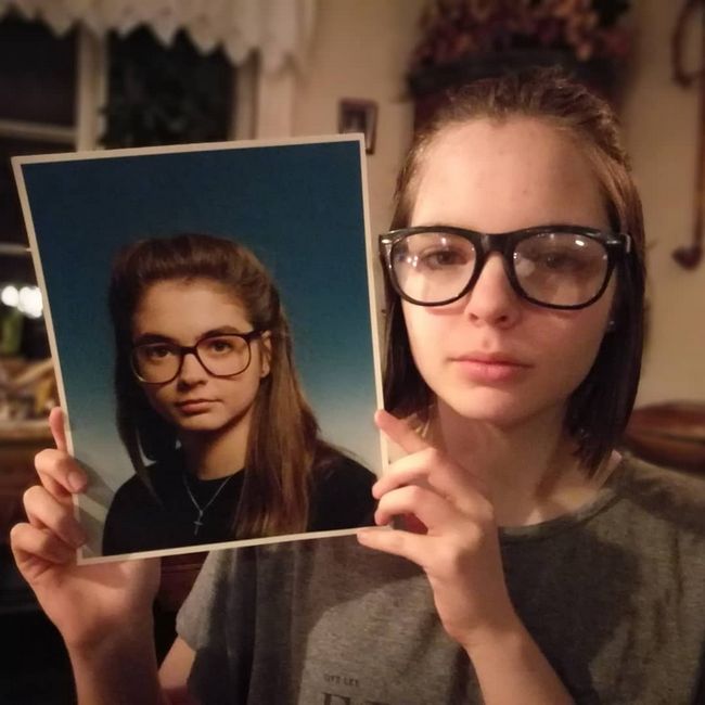 15 – Filha de 14 anos segurando o retrato da mãe aos 17. Idênticas