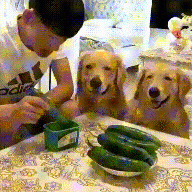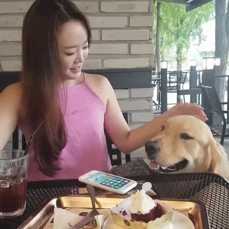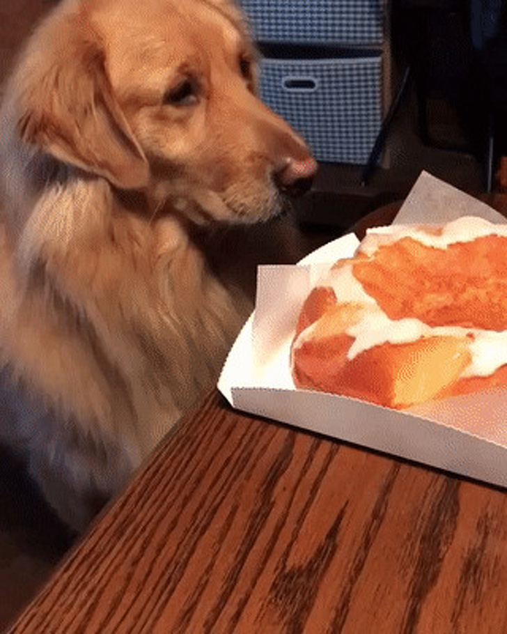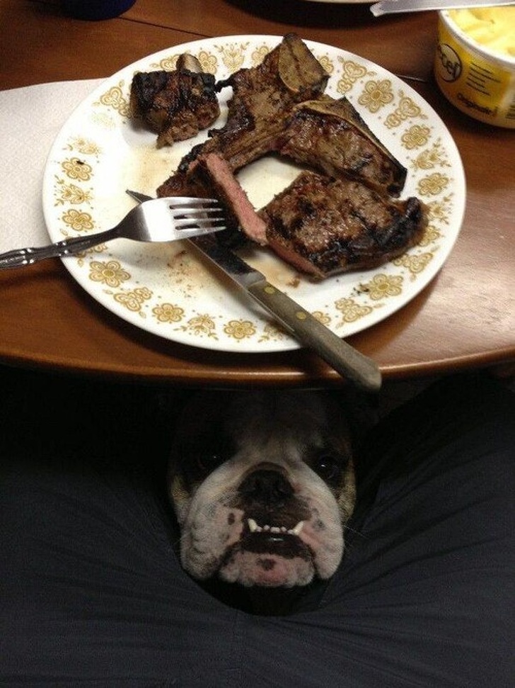 8. A este perro le dijeron que no pida la comida, y finge que no existe